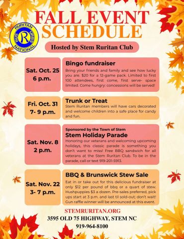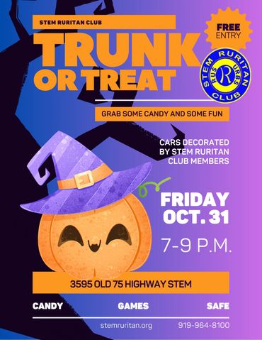 Stop by the Stem Ruritan Club on Halloween night for trunk or treat. The Stem Ruritan members will have their cars decorated and welcome ...